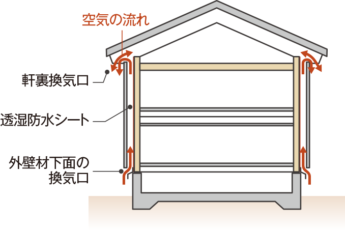 - 基礎と土台の間に湿気を排出するパッキンを使用。自然の気流を利用した全周換気で、カビなどの流入や結露を防止、耐久性を高めています。